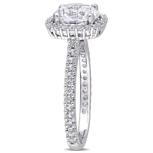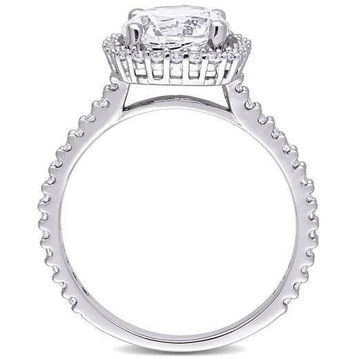 Sparkle with glory when you wear this Created White Sapphire Halo Engagement Ring. Crafted in lustrous sterling silver, this ring features a round-cut, prong-set created white sapphire gemstone (8 x 8mm) at the center with 24 round-cut, prong-set created white sapphire gemstones forming a cushion-shape halo and an additional 28 round-cut, buttercup-set created white sapphire gemstones resting on the band. Enhanced with a high polish finish, this alluring gemstone halo ring makes a stunning addition to any jewelry collection. Coordinate this gemstone ring with any ensemble for a stunning look.