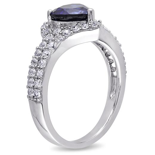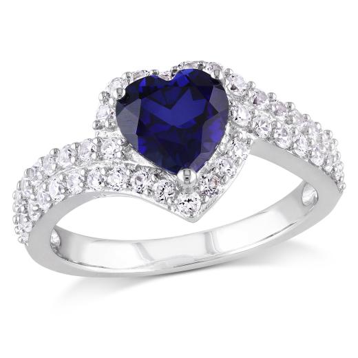 Show how devoted you are to her with this Created Blue Sapphire and Created White Sapphire Heart Halo Ring. Crafted in lustrous white gold, it features a heart-shape prong-set created white sapphire gemstone (7 x 7mm) at the center with a halo of 44 round-cut, prong-set created white sapphire gemstones studded on its double shank. Enhanced with a high polish finish, this flawless gemstone ring will be a memorable and timeless gift for your special someone.