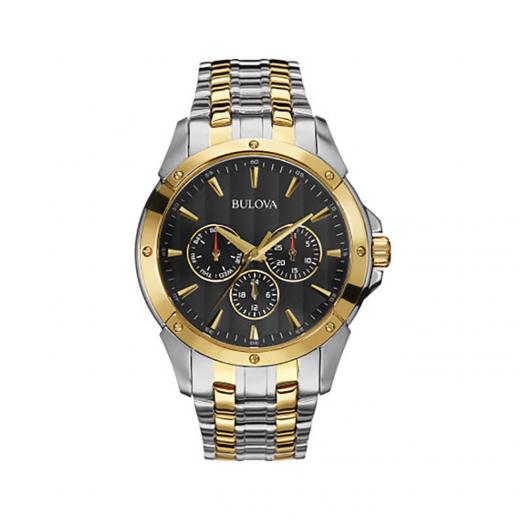 From the Sport Collection. Multifunction design in stainless steel with two-tone gold and silver ion-plated finish, patterned black dial, day, date and 24-hour sundials, screw-back case, double-press fold-over clasp with safety lock, and water resistance to 30 meters. Diameter: 43.0mm Thickness: 10.3mm