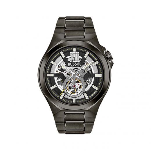 From the Automatic Collection. New Sport style in gunmetal IP stainless steel case, open aperture black dial with silver-tone accents and black inner dial ring, exhibition caseback, skeleton automatic movement with 40-hour power reserve, sapphire glass, gunmetal IP stainless steel bracelet with double-press deployant closure, and water resistance to 100 meters.