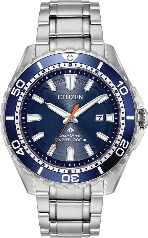 Citizen Eco-Drive round stainless steel case and bracelet, blue dial, anti-reflective crystal, ISO compliant, screw-back case, screw-down crown, one-way rotating elapsed-time bezel, 44mm case, 200M, safety fold over clasp with push button.