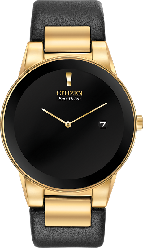 Citizen Eco-Drive round gold-tone stainless steel case, black leather strap, black dial, date, 40mm case, WR, buckle.