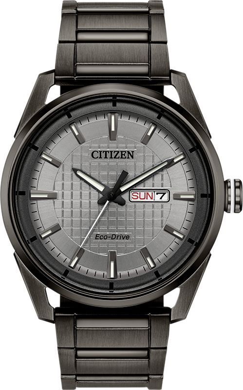 Drive from Citizen Eco-Drive round gray ion plated stainless steel case and bracelet, gray dial, domed crystal, day/date, 42mm case, WR100, fold over clasp with push button.