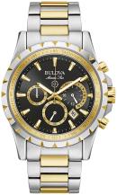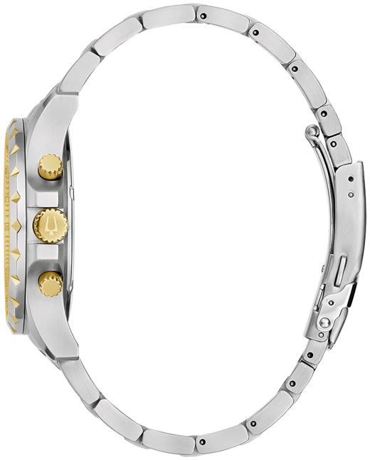 The Bulova Men's Two-Tone Marine Star Watch features a bold design with a stainless steel case, accented by gold-tone details. Its rotating bezel, luminous markers, and water-resistant capabilities make it both stylish and functional, ideal for those with an active lifestyle